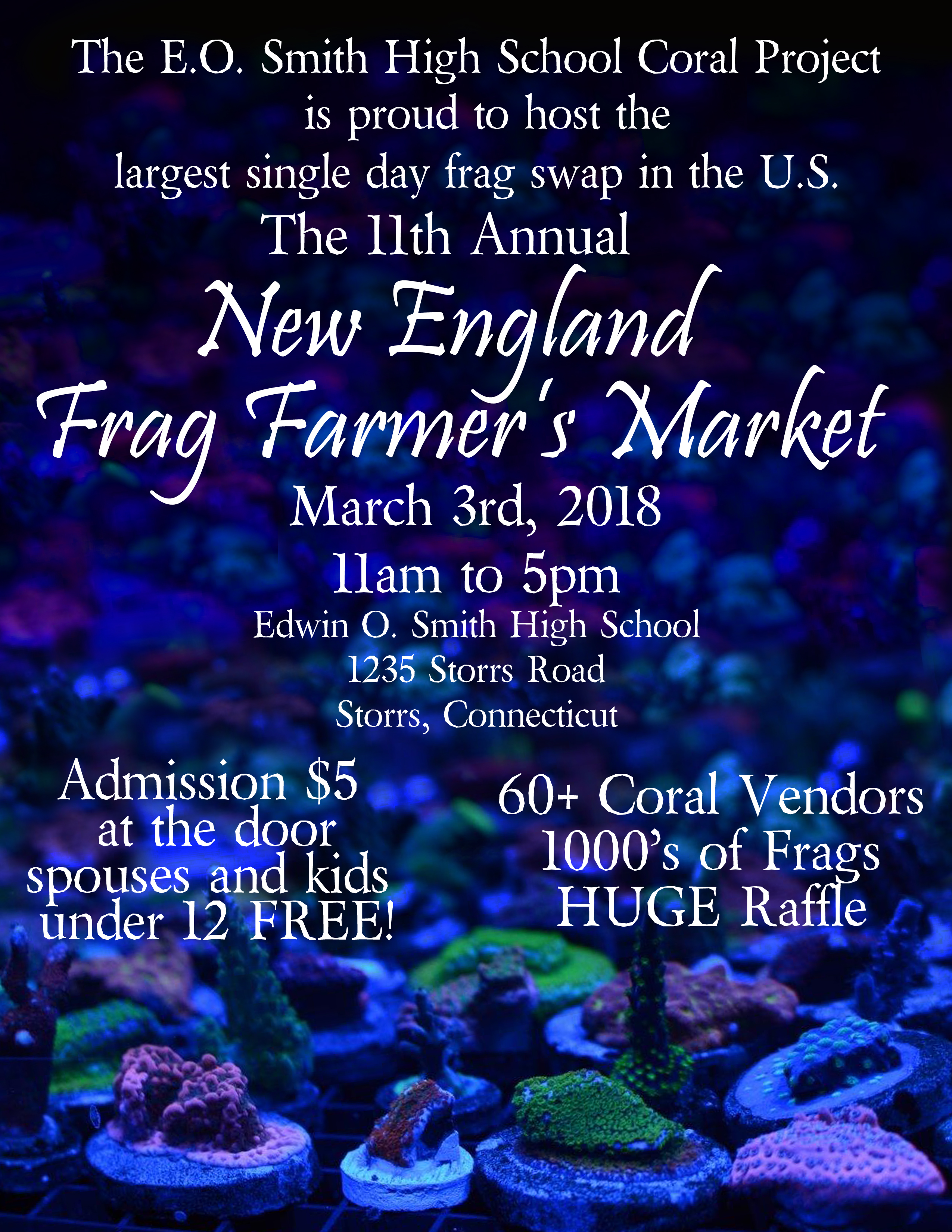What is FFM?Inspired by the idea of the the reef club frag swap, the New England Frag Farmer's represents a regional event with "farmers" from all over New England gathered to sell their home grown "crop." The E.O. Smith Coral Project opens the doors to the school for any local hobbyist, retail or online store to come in and set-up and sell farmedcoral frags. Admission is only $5, and anyone can come in and chat with the farmers, share information and get a few nice homegrown frags to stock their tanks. The Frag Farmer's Market has grown into the largest frag swap in the Northeast, with 60+ sellers and over 1100 people coming to shop for the 2017 FFM. |