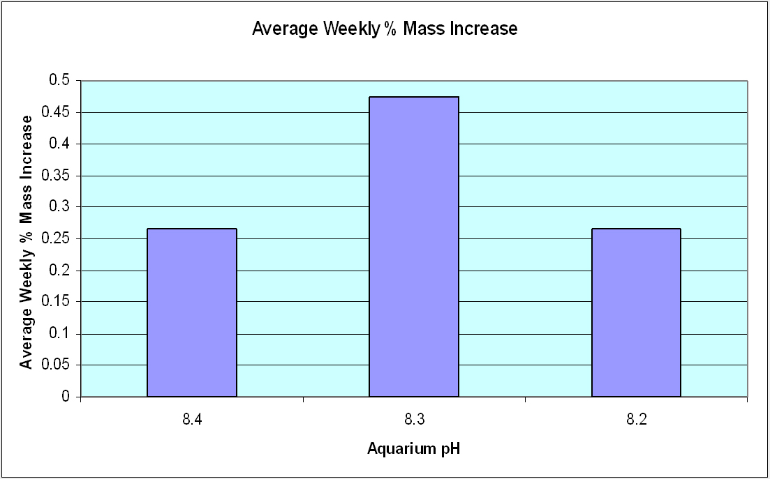 AnalysisThe data was interpreted by calculating weekly average growth. The coral in Tank 1 (pH 8.4) grew on average 0.266 g each week (n=90). This tank was the control, so it is surprising that the S. hystrix colonies in Tank 2 (pH 8.3) grew an average of 0.475 g each week (n=72). This data suggests that optimum pH for growth in this corals is closer to 8.3. The data suggests that the “control” tank was not at an optimum pH. This is supported by average pH values from the oceans: the pH in today’s shallow ocean is 8.2, which is lower than 8.3 in the Pre-industrial period [1]. The coral in Tank 3 (pH 8.2) grew an average of 0.265 g each week (n=110), similar to Tank 1, which also supports that 8.3 is the optimum pH. The quantitative effect of Global Warming is found to be a 44% decrease in mass per .1 pH unit variance from the optimum pH. Our oceans have already decreased to a pH level that is detrimental to coral growth. As expected, a small variance from optimal pH has a significant effect on coral growth. A potential source of error in this experiment was drying the corals before weighing. The water droplets were patted dry and the coral was weighed while damp. The error from the water likely balanced out and is insignificant, because there are many data points. |