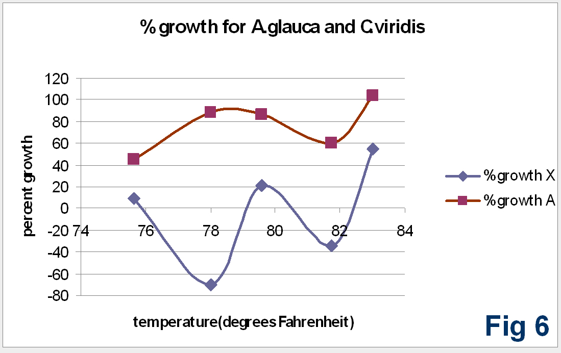 AnalysisAlthough the overall pattern of the two graphs appears to indicate an increase in growth as the temperature increases, the lines are far from linear. (fig 6) The 84ºF tank shows the highest growth rates for both coral species tested. The 76ºF tank shows that the temperature in lower levels might stunt the growth rate of both coral species. Observations of the individual corals tested suggest that higher temperatures may stress the corals. Two of the three A.glauca in 84ºF water were a pale green in color(fig 5) , as opposed to the white A.glauca in the cooler tanks. The C. viridis in the 84ºF water were white instead of green like normal C.viridis, and in other corals white denotes bleaching, or very stressed out corals.(fig 4)The rubbery mat was also very stiff compared to the colder temperature C. viridis, which made them break easier. |