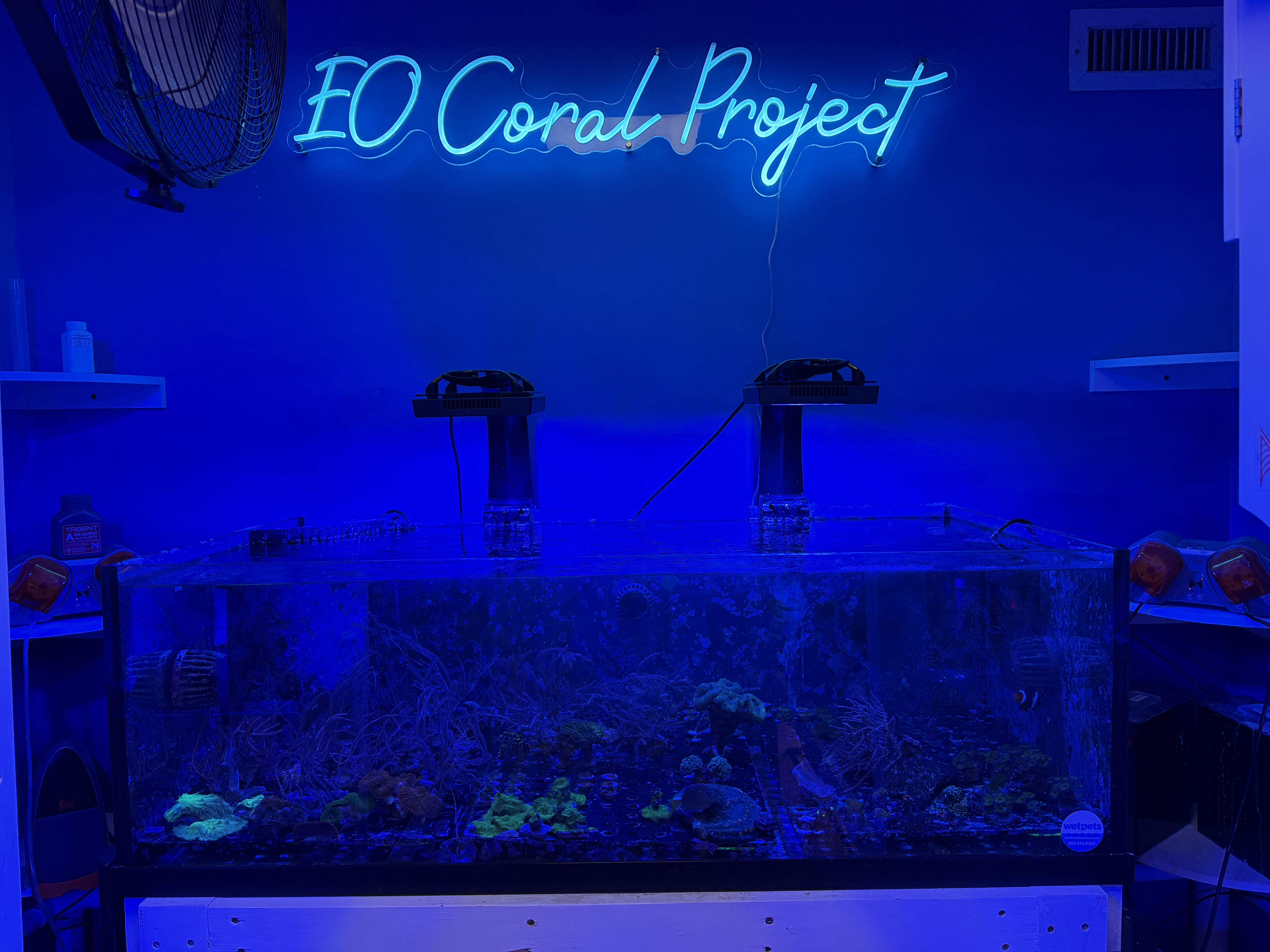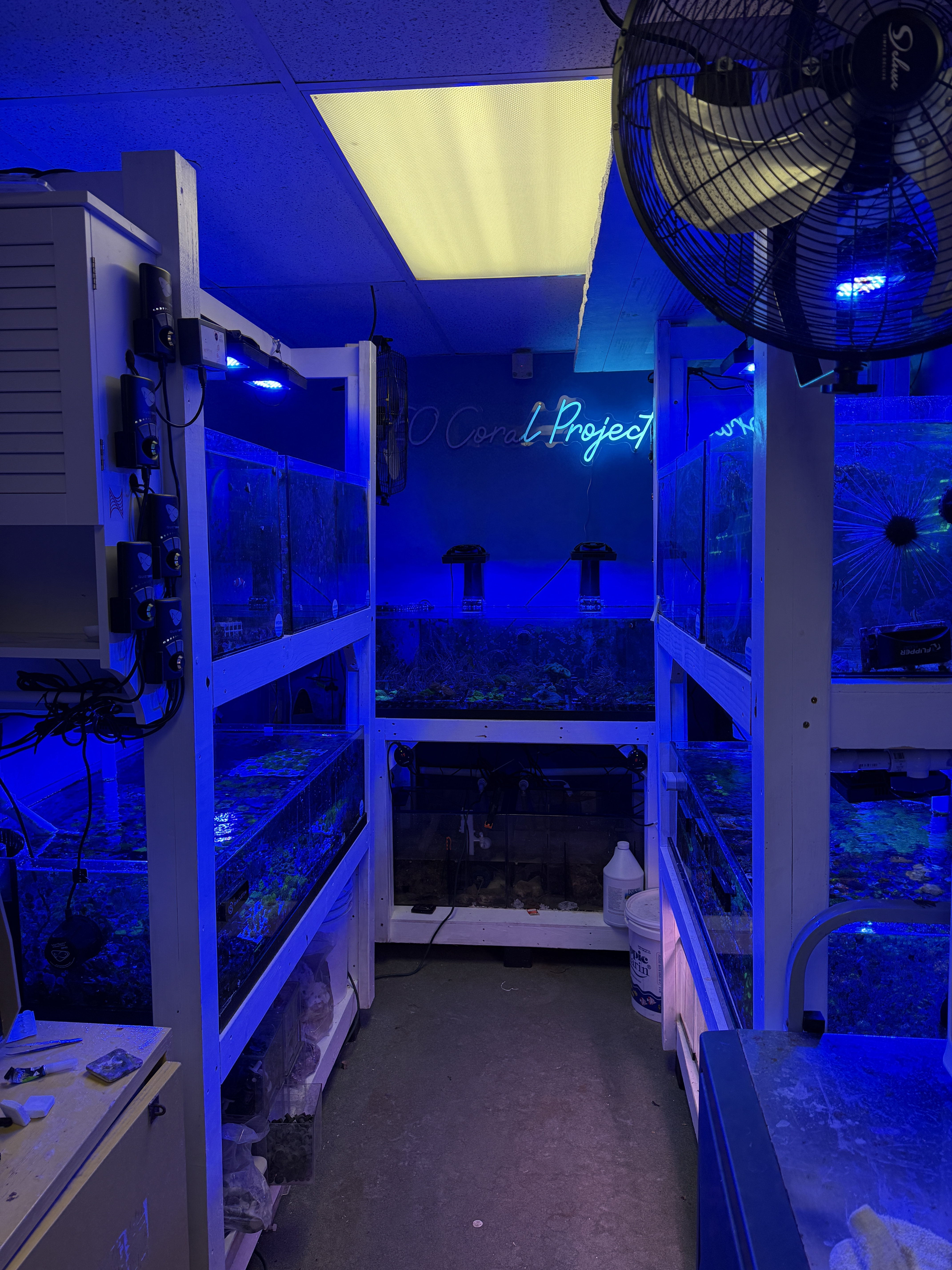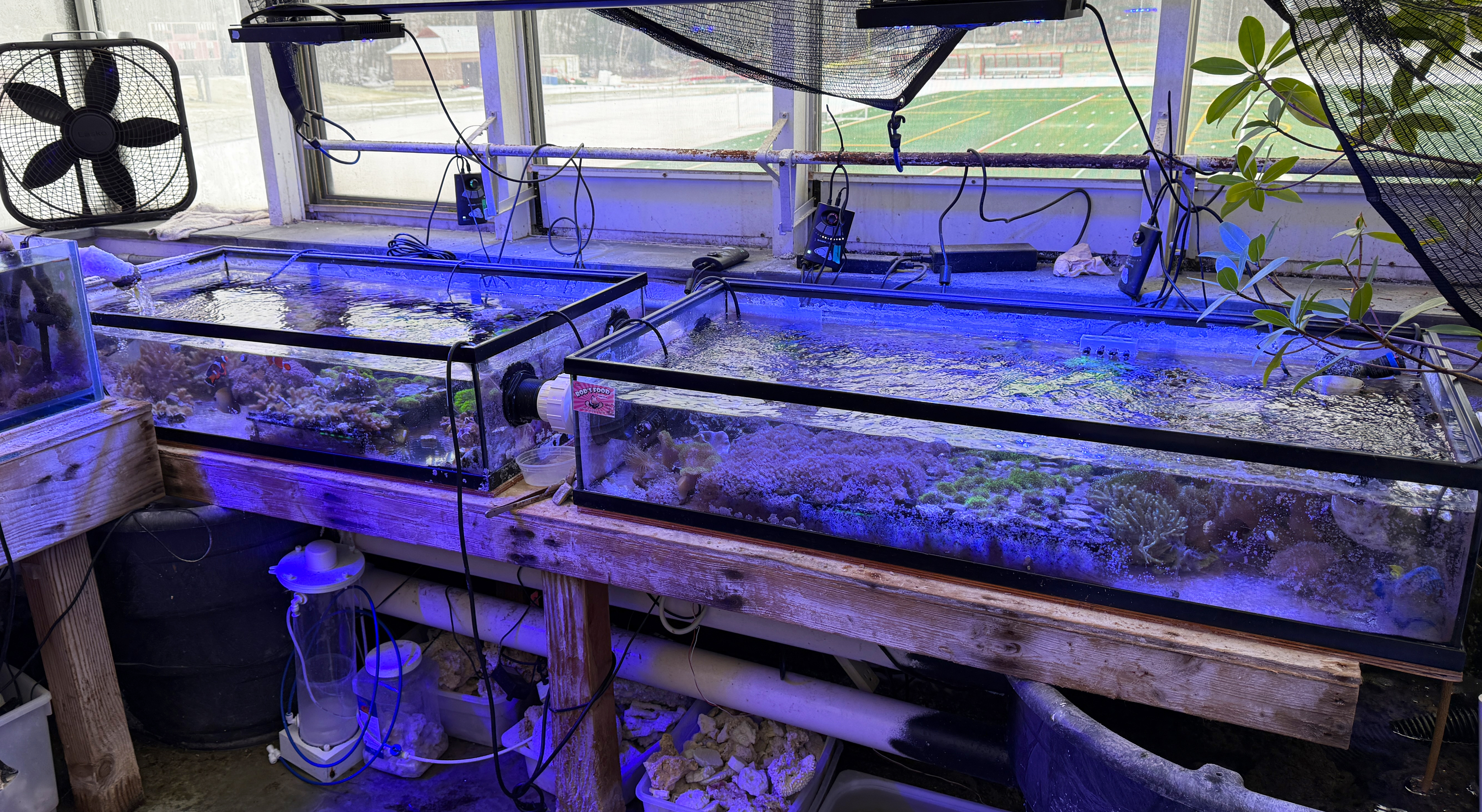 Thanks to a generous donation in 2023 from Andrew Sandler and Polo Reef, we were able to do a complete overhaul of our backroom frag system. With some help from the kids and a number of local reefers, we were able to design and install a brand new custom system for us to grow and carryout experiments in. The system consists of a single 6' sump (actually two plumbed together!) that feeds into two sets of three 25 gallon Waterbox peninsula tanks (one on either side of the room) , drilled to allow water to flow in through the input, but flow down into the tank below from the overflow. Each of the tanks is lit with a single XR15 Radion and has a side mounted MP10 for waterflow. This allows for customization of lighting and wateflow patterns if needed. Water from these upper tanks flows down into a 60 gallon Seapora frag tank, one for each set of three Waterbox tanks. Each of these is also drilled to allow the water to come in from above, and the traditional return, but also to allow the water from the overflow to flow back down into the central sump. These tanks are lit by a pair of XR15 Radions, with MP40's located at either end of the tank for water flow. The last part of the system is an 80 gallon Seapora tank set above the sump. This tank is again drilled to allow water in from the traditional return but to also drain down into the sump from the overflow. The tank is lit by 2 XR15's and water is churned by two MP40's at the ends of the tank and a single MP10 mounted on the back wall. The entire system is ~350 gallons in volume and gives the program a great place to breed/rear fish, grow corals, and carry out experiments. A huge shout out to Andrew Sandler and Polo Reef for their support to make this system a reality. For more information, check out the