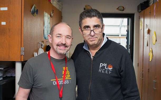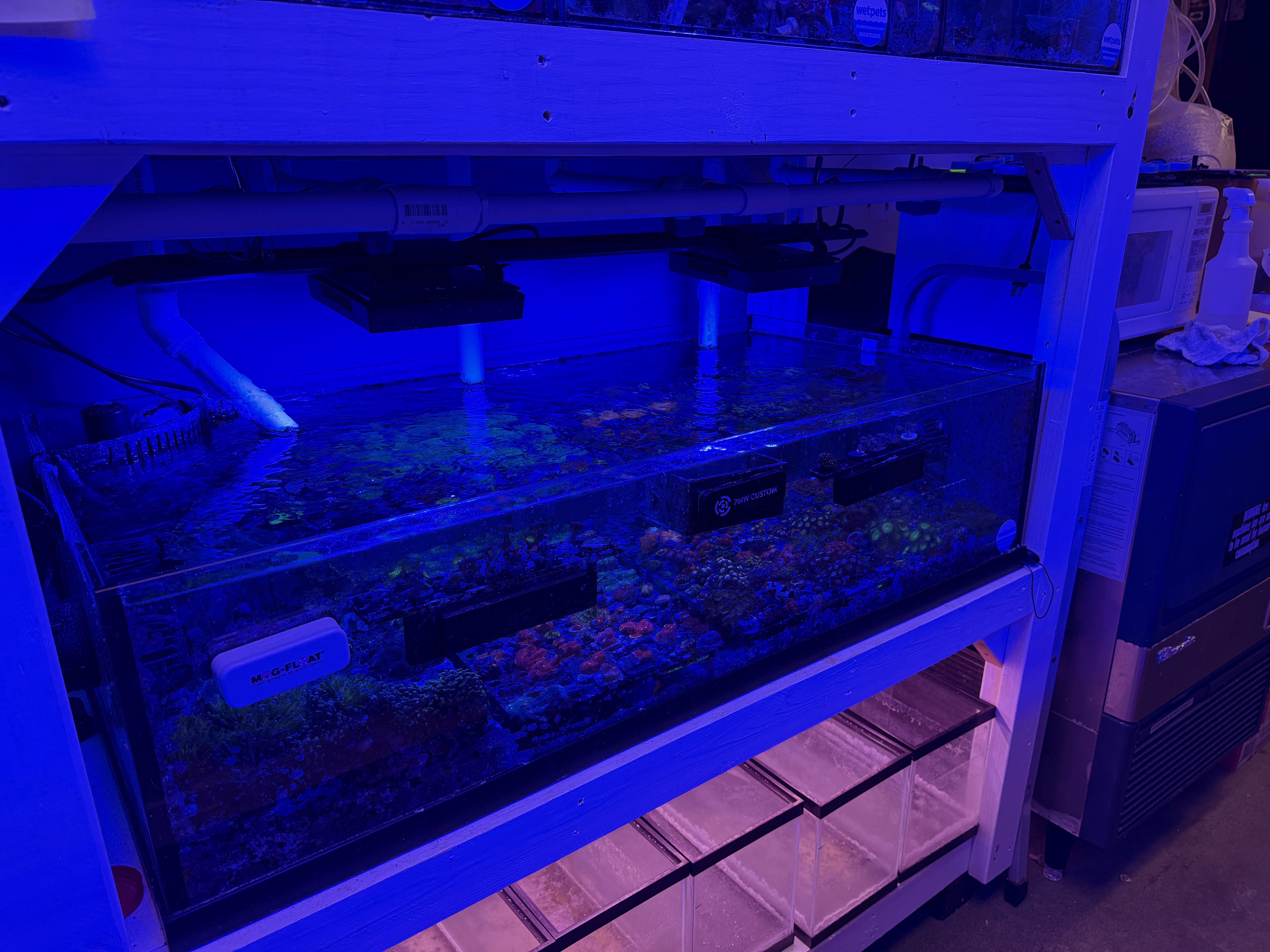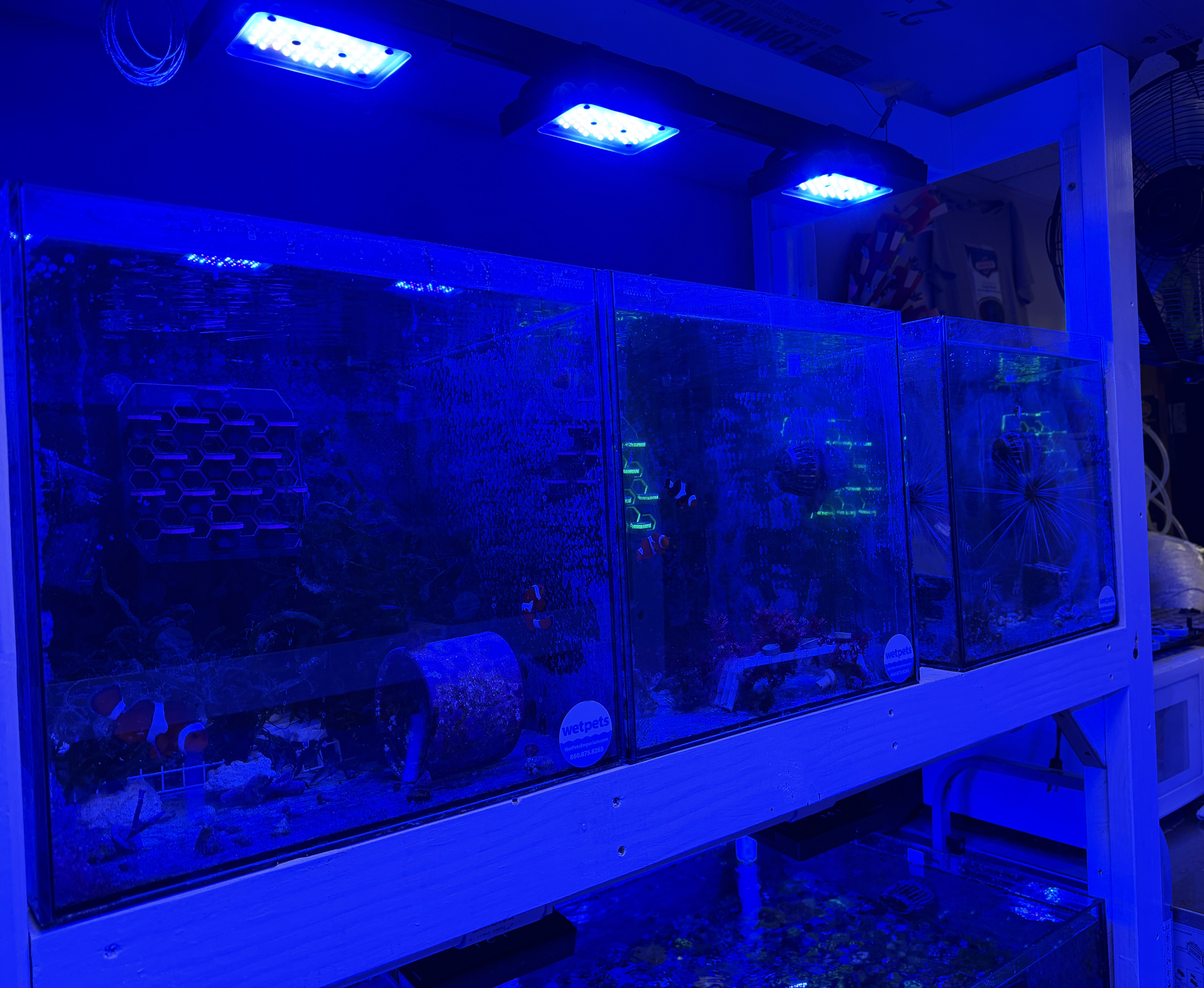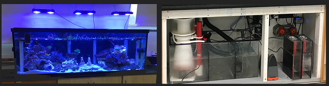 Thanks to a generous donation in 2023 from Andrew Sandler and Polo Reef, we were able to do a complete overhaul of our backroom frag system. With some help from the kids and a number of local reefers, we were able to design and install a brand new custom system for us to grow and carryout experiments in. The system consists of a single 6' sump (actually two plumbed together!) that feeds into two sets of three 25 gallon Waterbox peninsula tanks (one on either side of the room) , drilled to allow water to flow in through the input, but flow down into the tank below from the overflow. Each of the tanks is lit with a single XR15 Radion and has a side mounted MP10 for waterflow. This allows for customization of lighting and wateflow patterns if needed. Water from these upper tanks flows down into a 60 gallon Seapora frag tank, one for each set of three Waterbox tanks. Each of these is also drilled to allow the water to come in from above, and the traditional return, but also to allow the water from the overflow to flow back down into the central sump. These tanks are lit by a pair of XR15 Radions, with MP40's located at either end of the tank for water flow. The last part of the system is an 80 gallon Seapora tank set above the sump. This tank is again drilled to allow water in from the traditional return but to also drain down into the sump from the overflow. The tank is lit by 2 XR15's and water is churned by two MP40's at the ends of the tank and a single MP10 mounted on the back wall. The entire system is ~350 gallons in volume and gives the program a great place to breed/rear fish, grow corals, and carry out experiments. A huge shout out to Andrew Sandler and Polo Reef for their support to make this system a reality. For more information, check out the