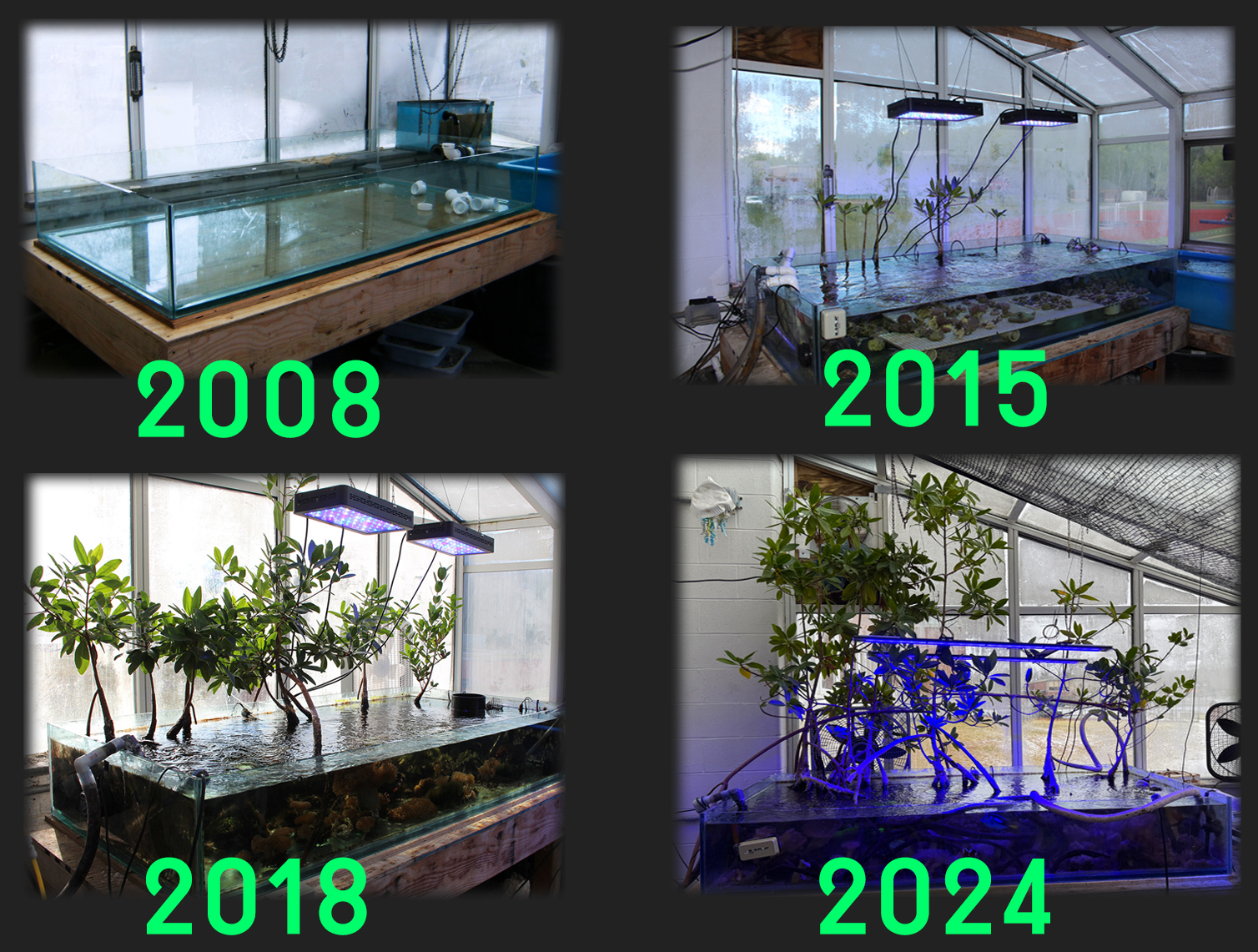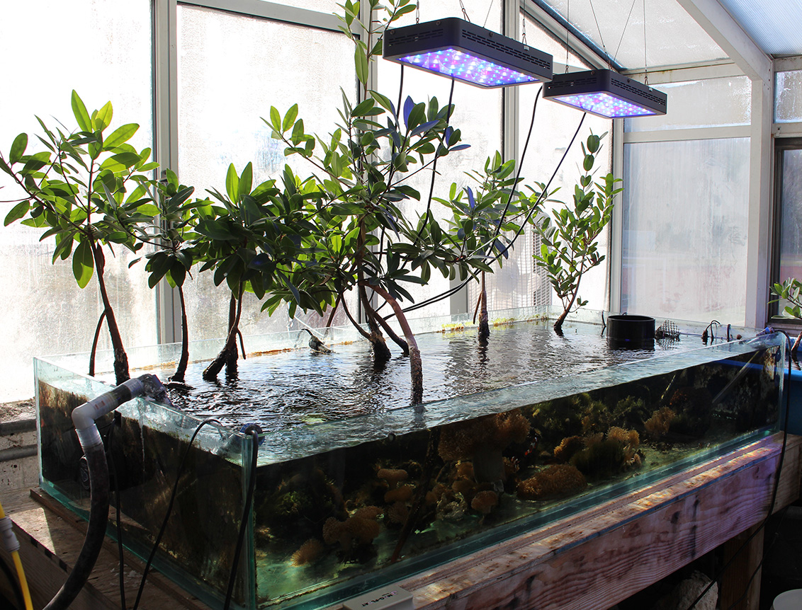 The Mangrove TankThe coral propagation system in the greenhouse consists of a series of tubs and tanks all plumbed together to form a single system with a volume of approximately 600 gallons. Water is pumped from the primary sump (a 100 gallon Rubbermaid tub) into a custom made 72” x 36” x 12” glass frag tank, made by GlassCages.com. The tank is lit by a combination of natural light and 2 AI Blade LED fixtures suspended ~30" off the surface of the water. Circulation within the tank is accompished using two Ecotech Marine MP40 Vortec pumps at opposite ends ofthe tank and a pair of MP10's set on the back side of the tank. Also arranged in the back of the tank are a number of mangroves, both white and red. They have been in the tank since 2013 with most grown from seedpods or tiny growth plants. By far, this is the most impressive tank we have at the school, creating a mangrove forest in our CT greenhouse! |